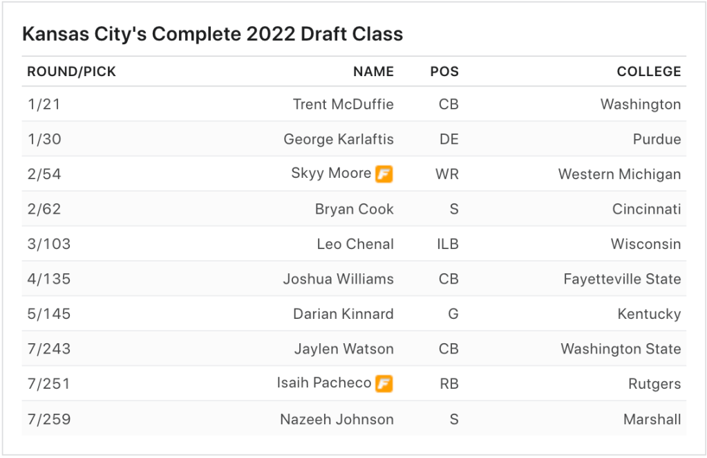 Bryan Cook and Leo Chenal have future starter potential and I would not be surprised to see Chenal grab a role this year. The rest of the draft they took players that all have traits and could start, but they will need time to develop. But any time you can acquire five starters (either day one or in the future) in the first 103 picks, you’re doing a damn good job. The cherry on top was getting Justyn Ross as a UDFA, who would have been a first round pick if not for a laundry list of injuries that kept him from being drafted. If he could stay healthy in any form or fashion, I would not be surprised to see Ross as a future starter at wide receiver.