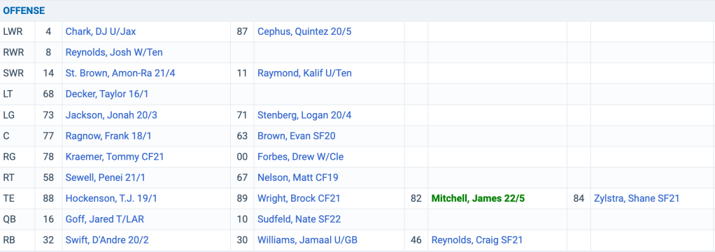 Obviously everyone knows that TJ Hockenson is the TE1 on the roster. The question is whether or not TJ Hockenson will play out the full season. Hockenson has quite a bit to prove at this point in his career. He is an above average tight end but he has not shown the ability to stay healthy or the skills to claim his spot as an elite tight end. That’s not to say that he cannot be that player and does not have that ability. He just has not shown that he was worthy of that draft selection yet. So far he has played one full season in his career and has not surpassed 725 yards receiving and last year he had a career low yards per catch of 9.6. He is far from a lost cause though. Ben Johnson is now the offensive coordinator for the Lions and he was previously the tight ends coach…Hockenson has also told the media that he is going to be moved around the offense more and will be used as more of a chess piece instead of lining up in line most of the time. I’m excited to see how this goes and I am hopeful…but he has a lot to prove if he wants to get a monster extension. As far as the rest of the group? They’ve been solid but I do not expect much. James Mitchell intrigues me moving forward coming off the ACL tear but he still has a bit to go and was behind Brock Wright and Shane Zylstra for much of camp. All the more reason Hockenson needs to stay healthy.