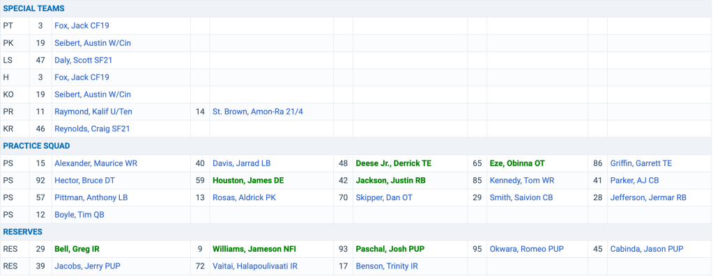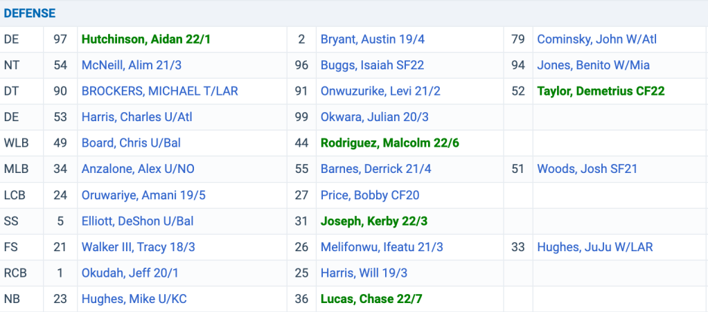 The secondary still gives me the heebie jeebies. I get that Jeff Okudah won the second starting corner spot and that is all well and good…but he still struggled at times in the preseason. He’s had to totally rebuild himself multiple times so I’m willing to give him a shot. It’s far better to find out what he has right now that to continue protecting him and hoping he splashes…toss him in the deep end. Amani Oruwariye had a great season last year and will look to build off of it as the unquestioned CB1…but this group is going to have opposing QBs salivating if the defensive front cannot get any pressure. Mike Hughes should start in the nickel and Will Harris has completed the move to cornerback, even if it has not always been pretty. Chase Lucas is just about 40 years old and has shown some flashes, but he is just about at his ceiling. Bobby Price and Jerry Jacobs remain intriguing options…but again, none of it is pretty. At safety, at least Tracy Walker should be able to provide some stability. Kerby Joseph looked rough in the preseason so he will definitely be behind DeShon Elliott to start the season. Ifeatu Melifonwu has made the conversion to safety officially, as was expected with the Will Harris flip, and I’m not what to expect with him. I like his athletic profile but he’s a work in progress. I think the best way to sum things up is this is a total grab bag secondary. When Oruwariye and Walker are your two best DBs, it’s going to make for some interesting times in a pass happy league. This is where Aaron Glenn is going to have to step up and scheme everything out to get everyone in the best position possible to succeed. If the defense is good this year, it’ll be because of him and I would expect him to have a head coaching gig in short order afterwards.