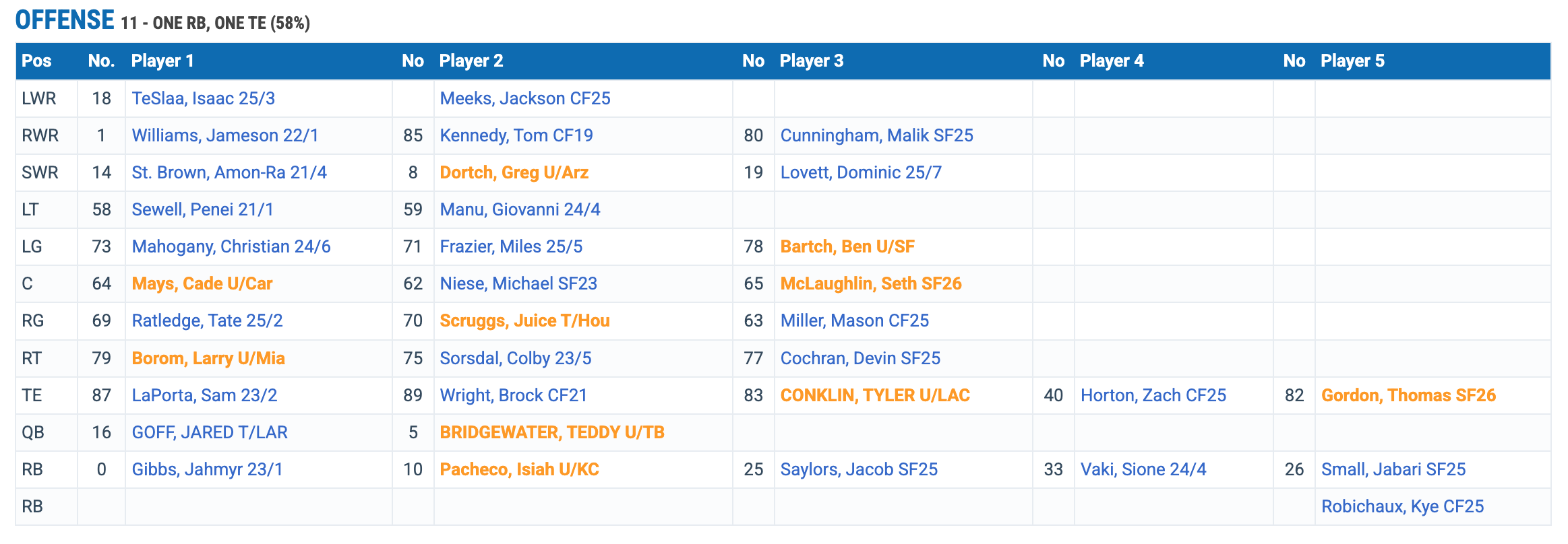 LT Penei Sewell LG Christian Mahogany/Ben Bartch/Miles Frazier C Cade Mays RG Tate Ratledge RT Larry Borom/Rookie