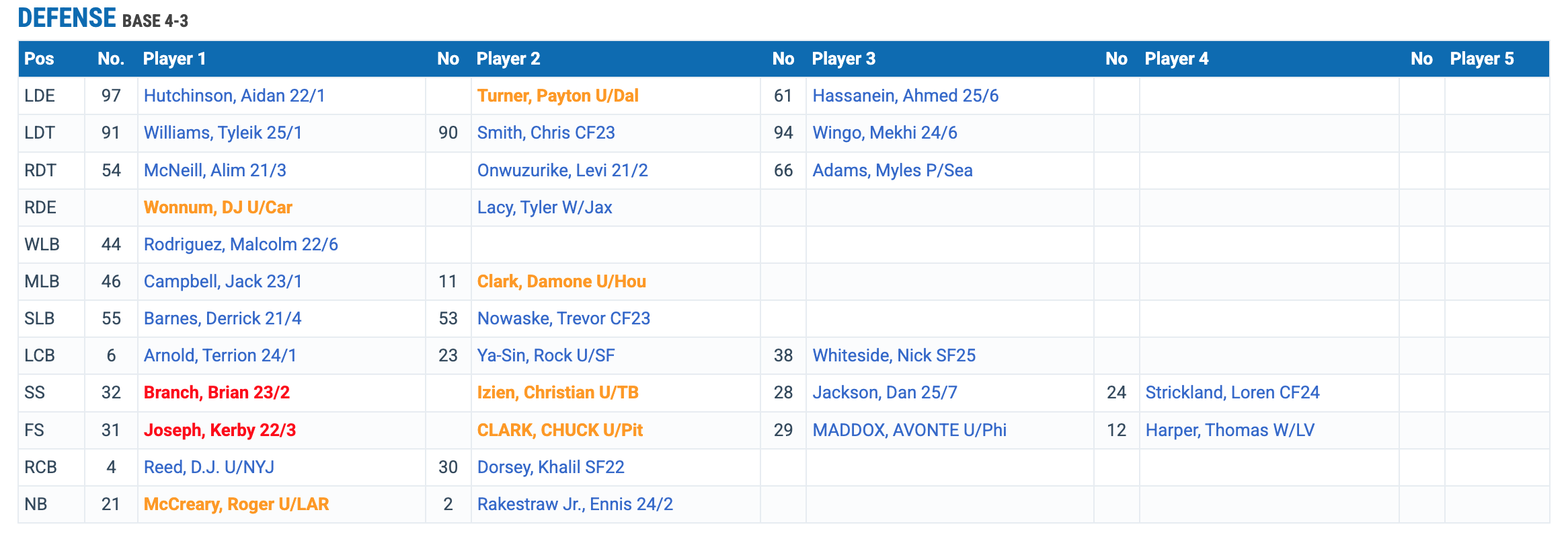 Linebacker…what is there to say? Jack Campbell and Derrick Barnes are good starters. Rodriguez, Clark and Nowaske all provide great depth. They’re missing one more starting linebacker. If they were to draft a SAM linebacker then they could move Barnes to WILL and all would be great. Fortunately, this unit is pretty sturdy compared to the rest of the defense. I would not be surprised if this was one area on defense they chose not to address early on and rolled with their guys.