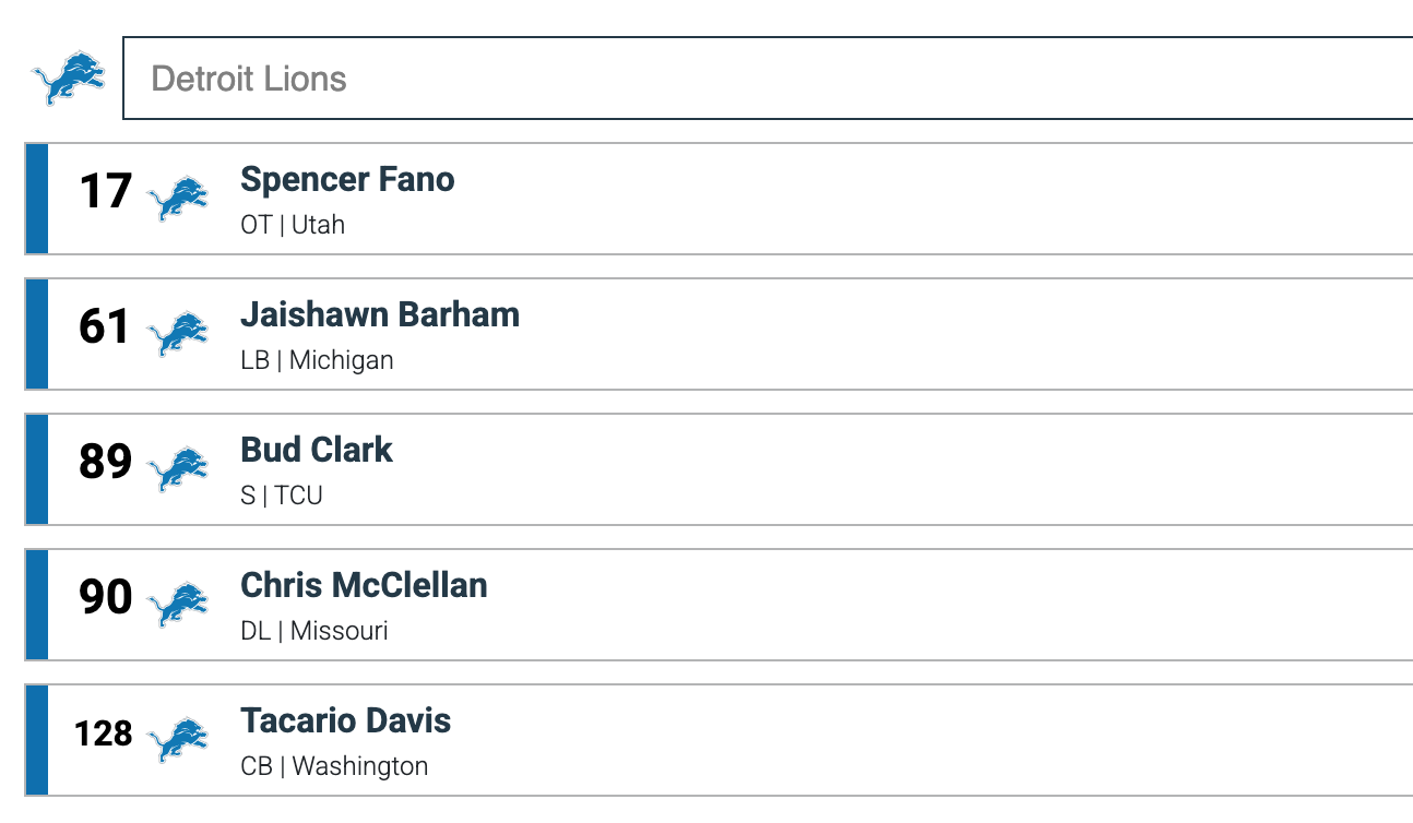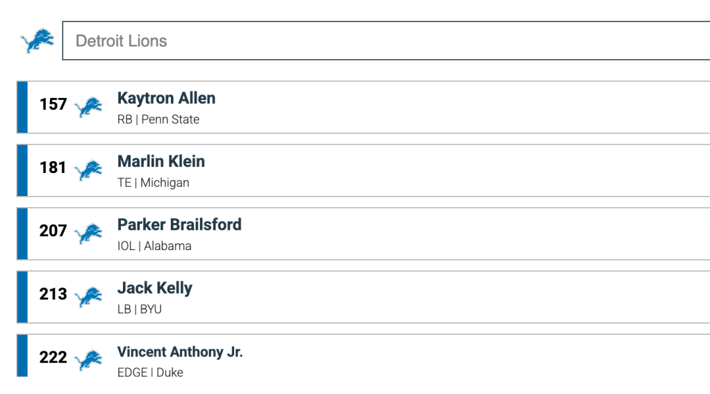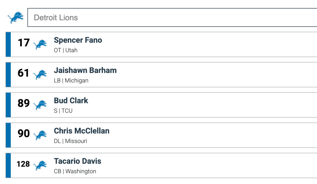 Past that, I think that is it for the offense. You’re not going to be able to address all of your needs. They do not have a future starter at QB on the roster. RB looks thin if Gibbs or Pacheco go down and like I said, TE is a bit hairy. I’m guessing they take a stab at a TE late because of the depth of this class and they maybe explore adding another RB in free agency.
